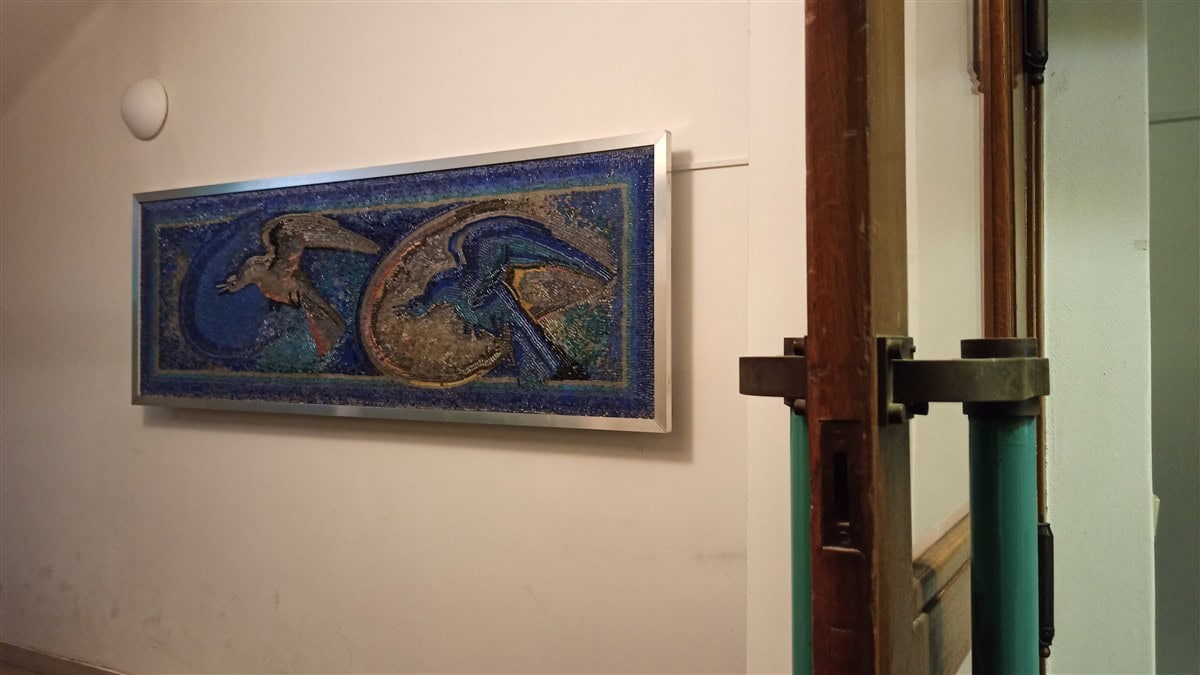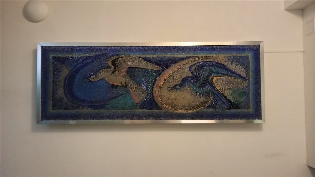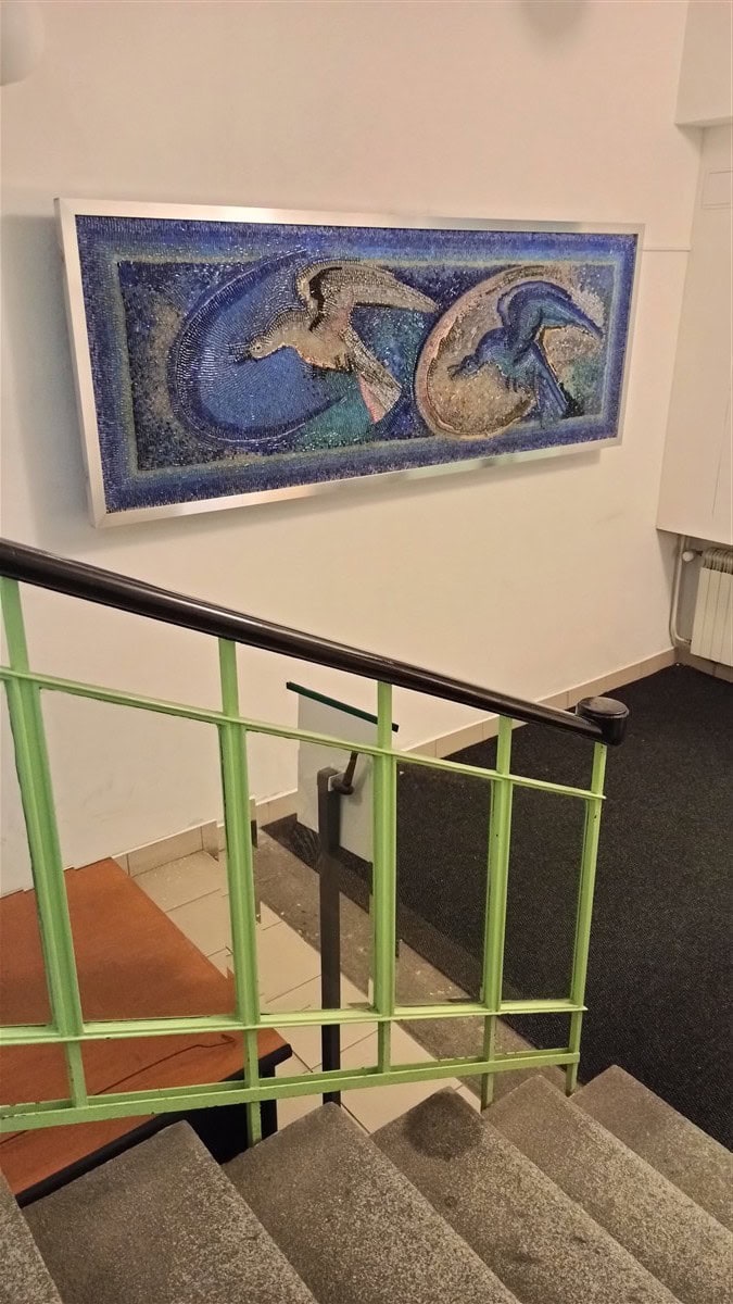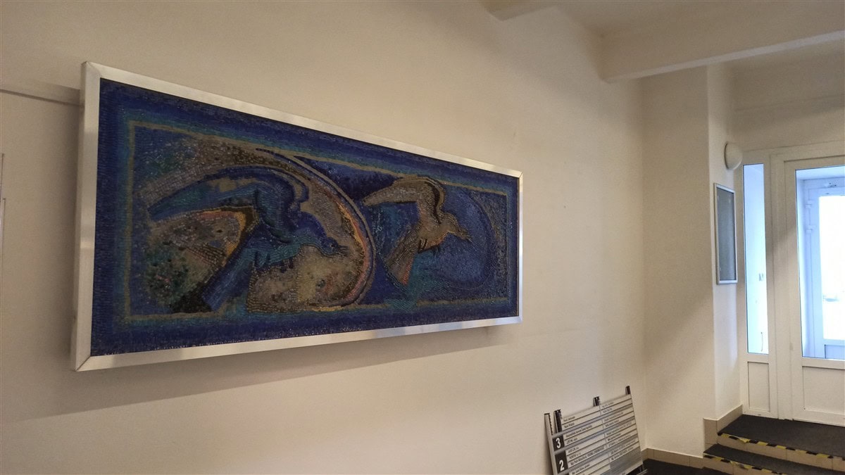Náš Ateliér sídlí v budově bývalého Sklářského ústavu. Při jeho vchodu se nacházely dvě skleněné mozaiky, které se při pozdějších úpravách ocitly schované za druhotnou příčkou vrátnice. Protože nebylo možné příčku odstranit, po dohodě s majitelem jsme mozaiky demontovali, očistili a osadili na stěnu chodby, aby byly opět na očích.